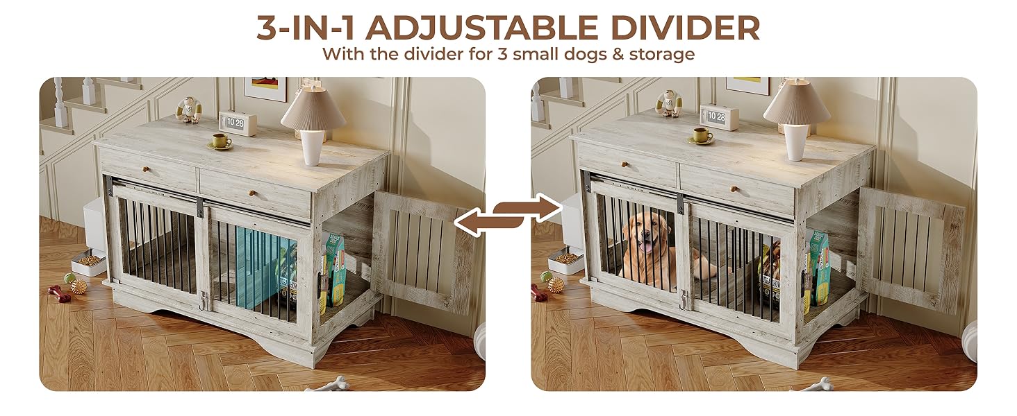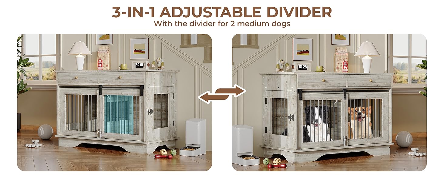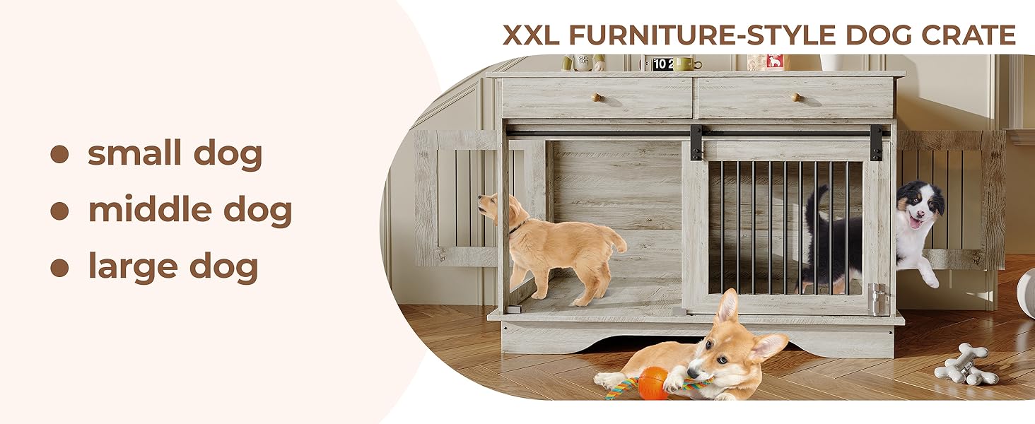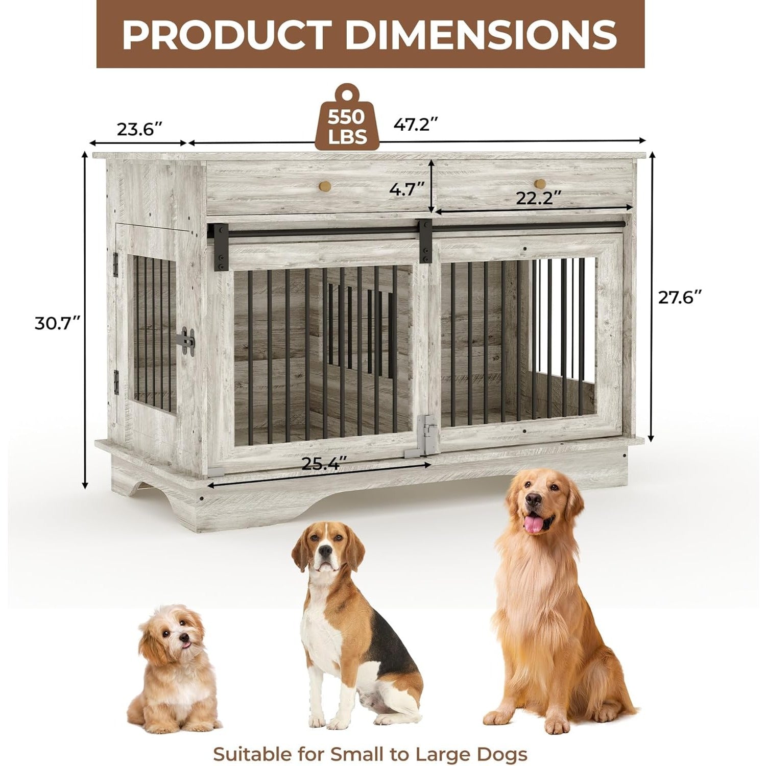 47'' Heavy-Duty Wooden Dog Crate Furniture Kennel with Barn Door & Triple Door Design, 2 Storage Drawers, Removable Divider - Multi-Functional Pet Cage End Table for Large Dogs, Medium Dogs, Small Breeds (Pomeranian, Chihuahu