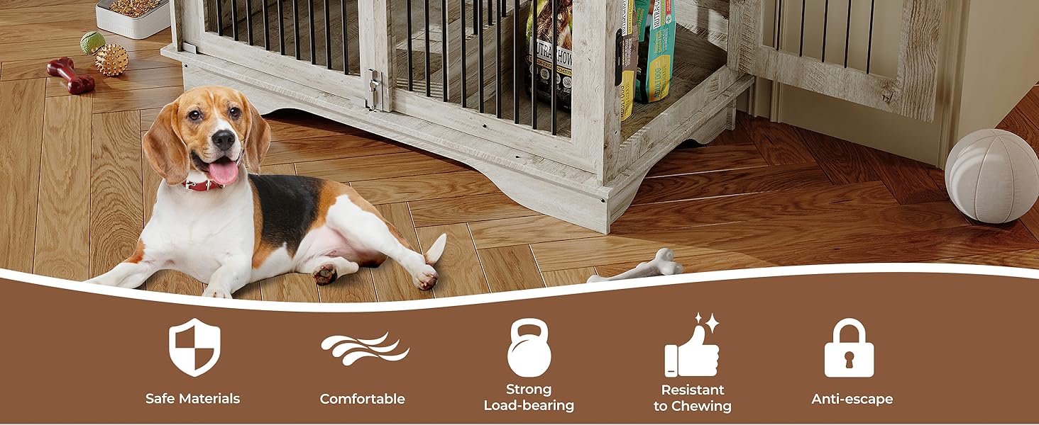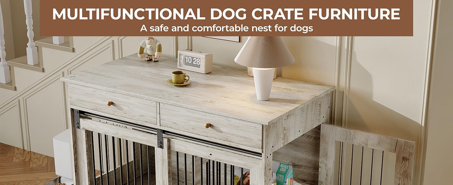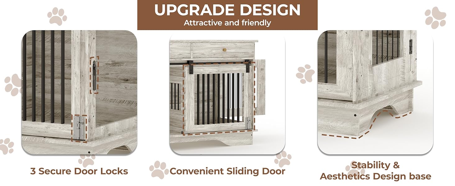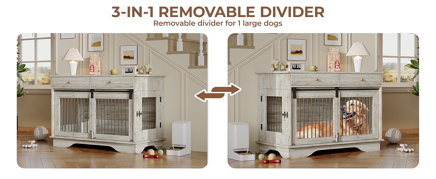47'' Heavy-Duty Wooden Dog Crate Furniture Kennel with Barn Door & Triple Door Design, 2 Storage Drawers, Removable Divider - Multi-Functional Pet Cage End Table for Large Dogs, Medium Dogs, Small Breeds (Pomeranian, Chihuahu
